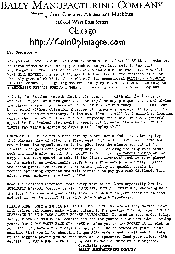 Rocket Pack - Bally letter explaining the virtues of the first automatic payout pinball.