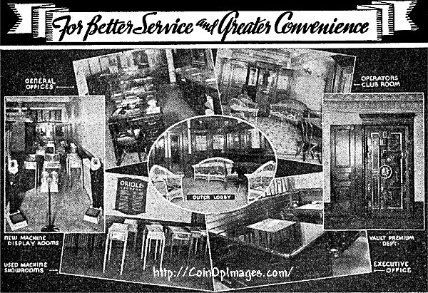 November 1934 Oriole Coin Machine ad portion showing the various portions of their office in Pittsburgh.