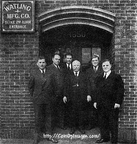 Tom Watling and five of his sons, representing the power behind Watling Manufacturing. Left to right we have Bill (manager, scale dept.), Walter (manager, machine dept.), Tom, Albert (sales manager), Burns (superintendent, slot dept.), Johnny (general manager).